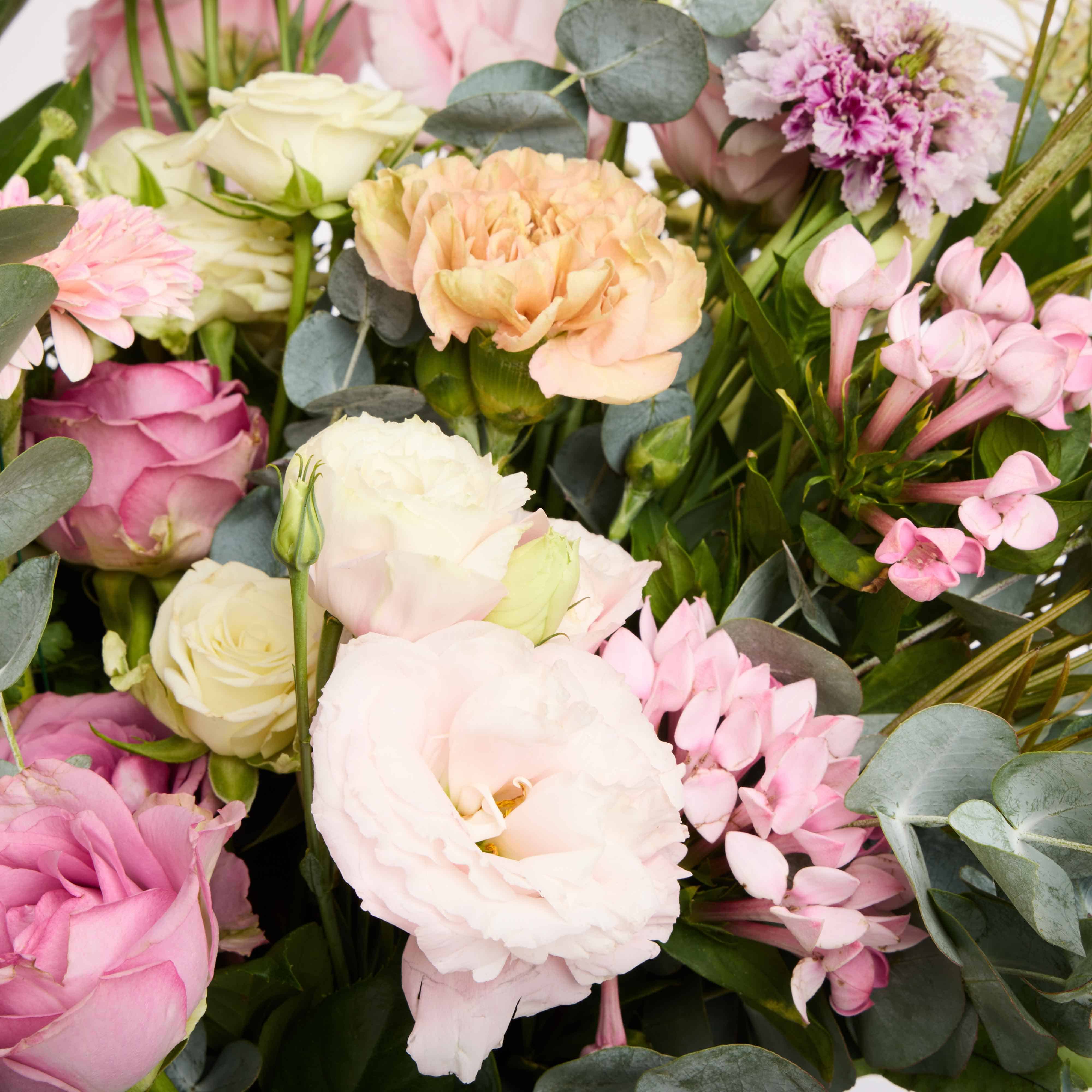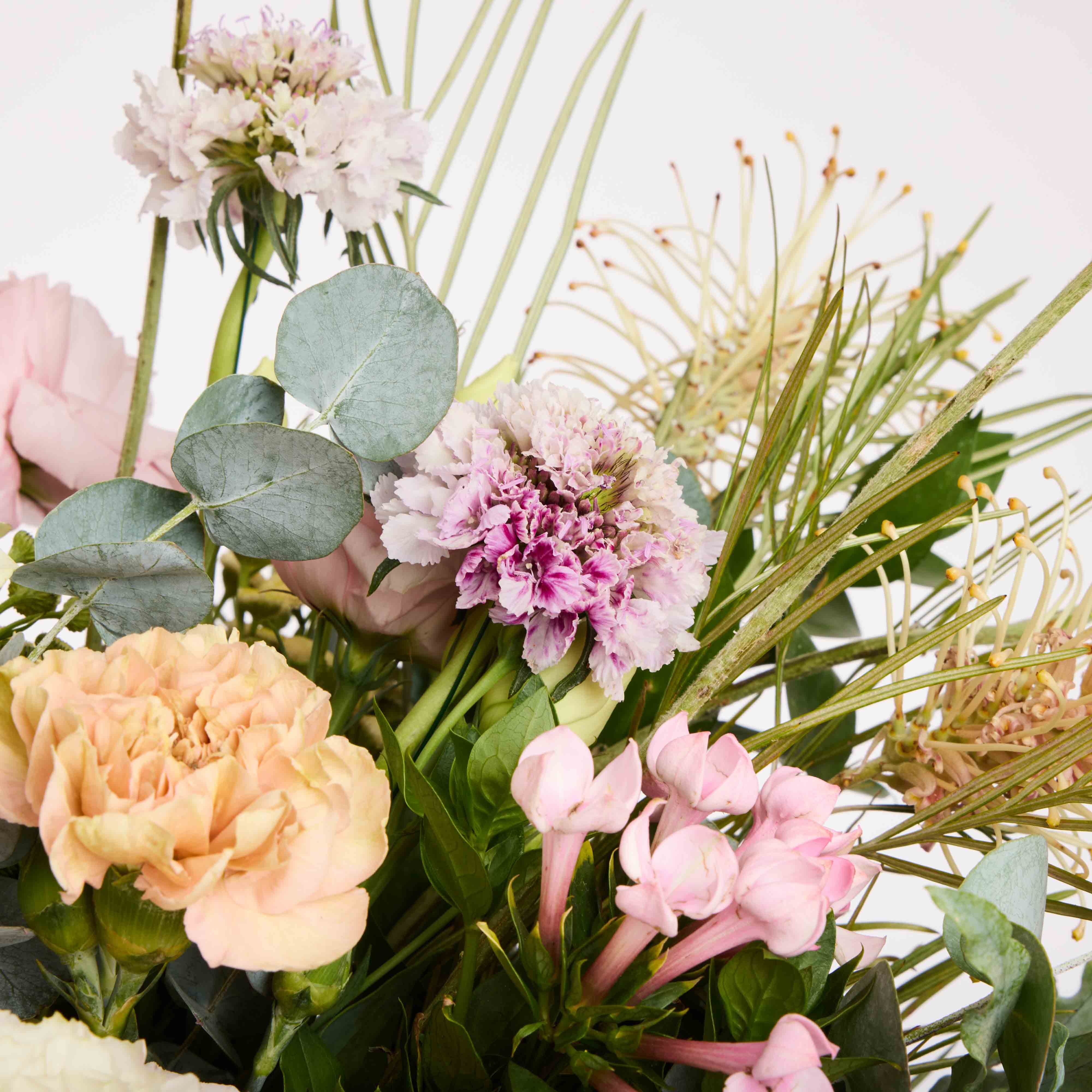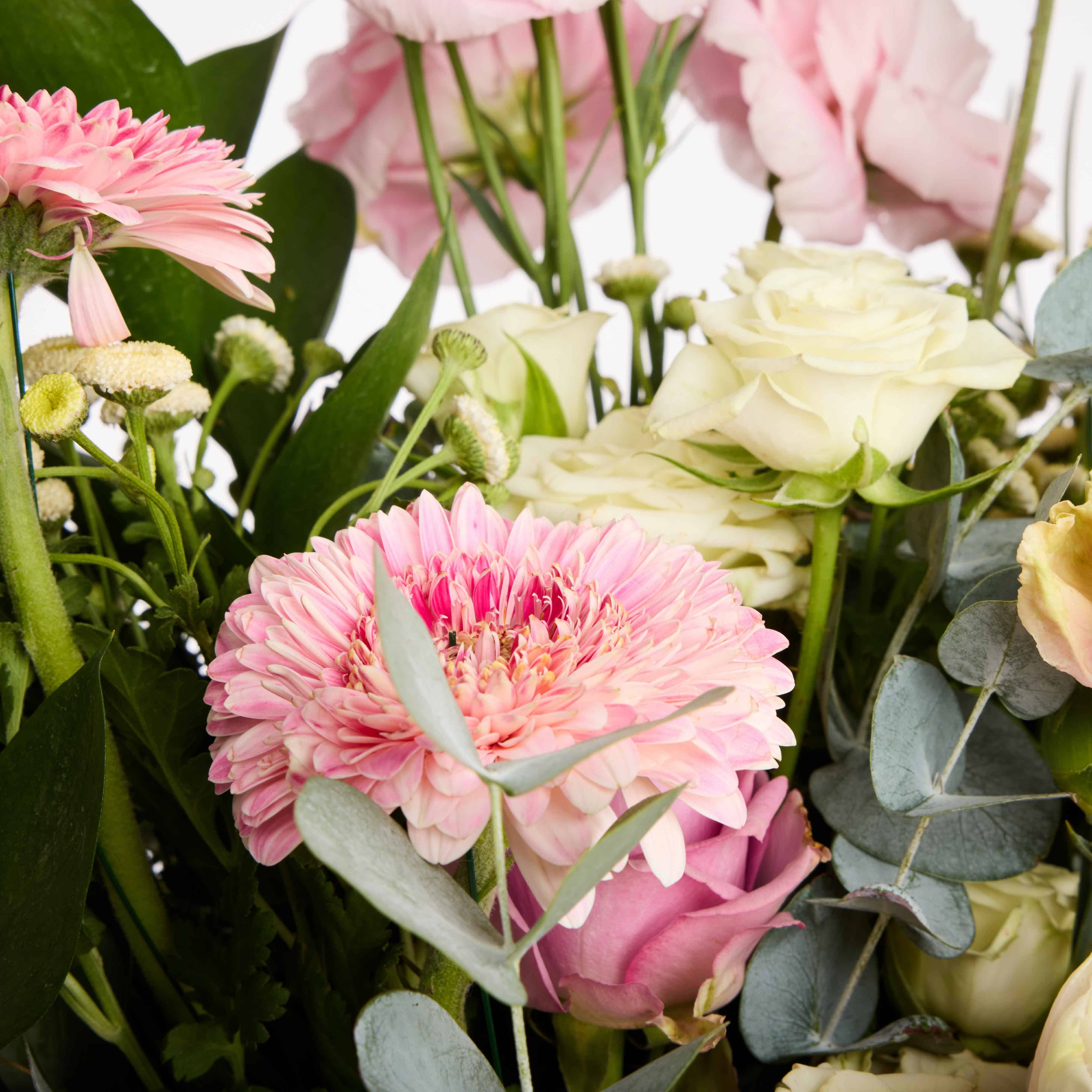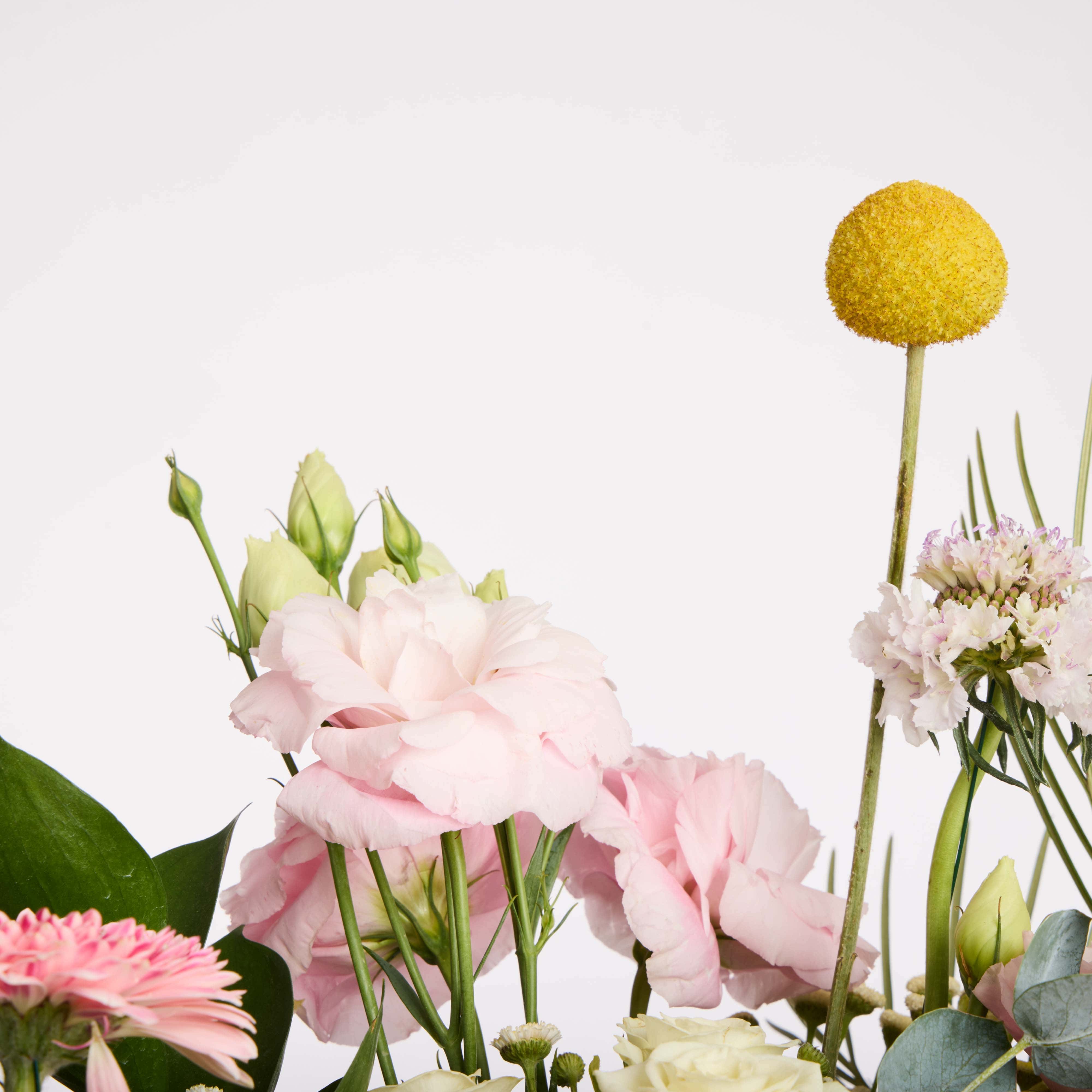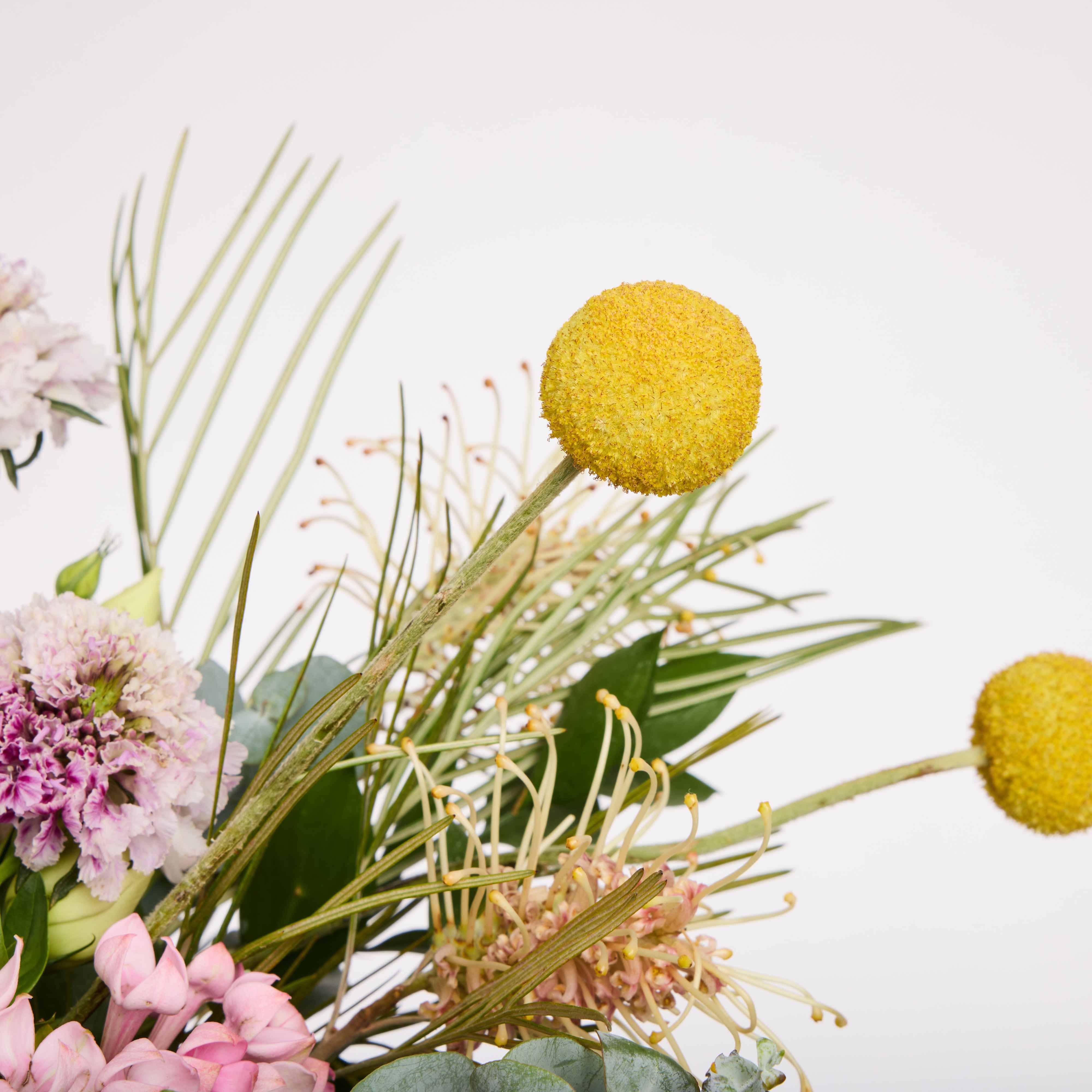 זר פסטלי רגוע עם טוויסט עליז – שילוב של ורודים, לבן וירוק בגבהים וטקסטורות משתנות, בשילוב קרספדיה צהובה שתקפיץ אותו יחד עם כל פינה בבית.