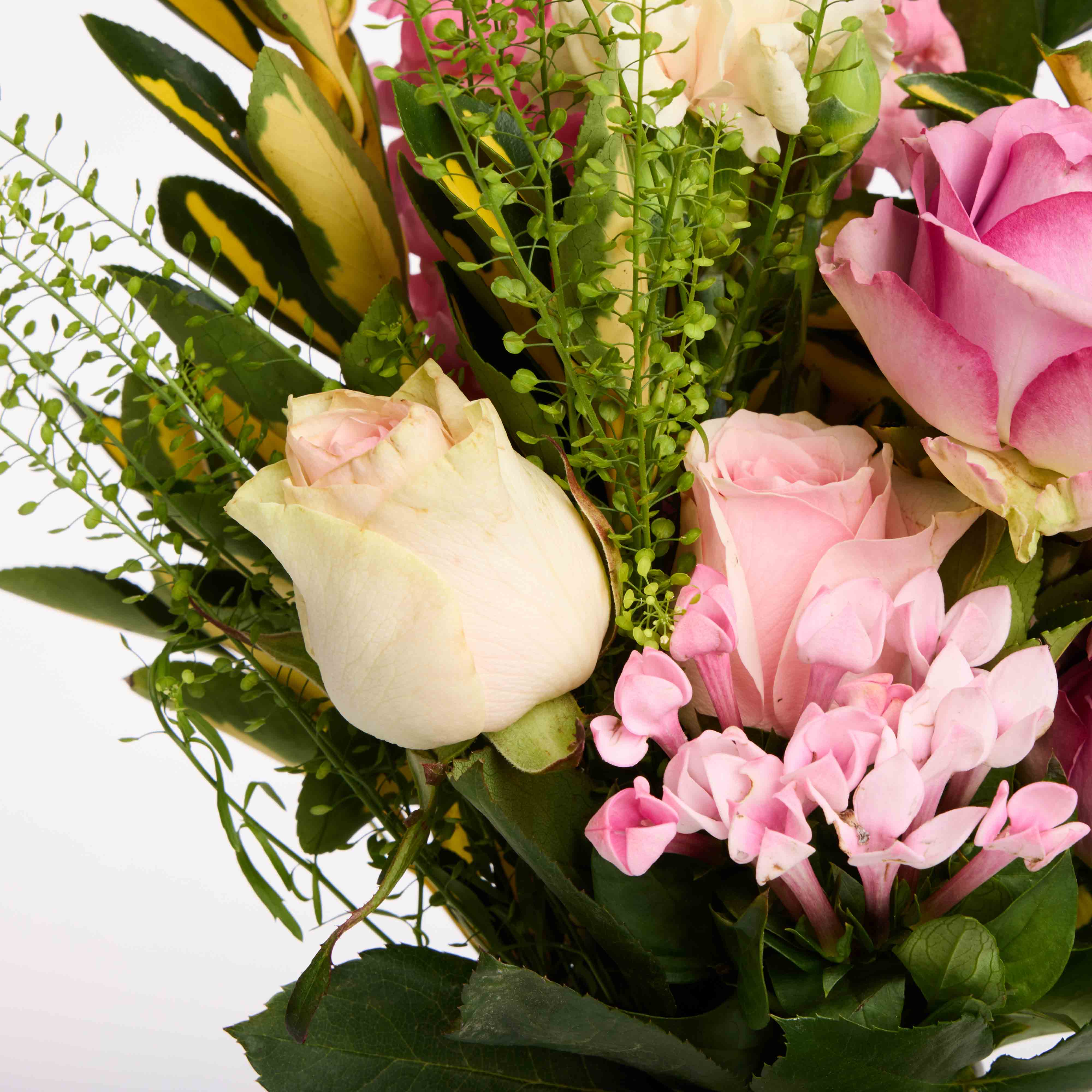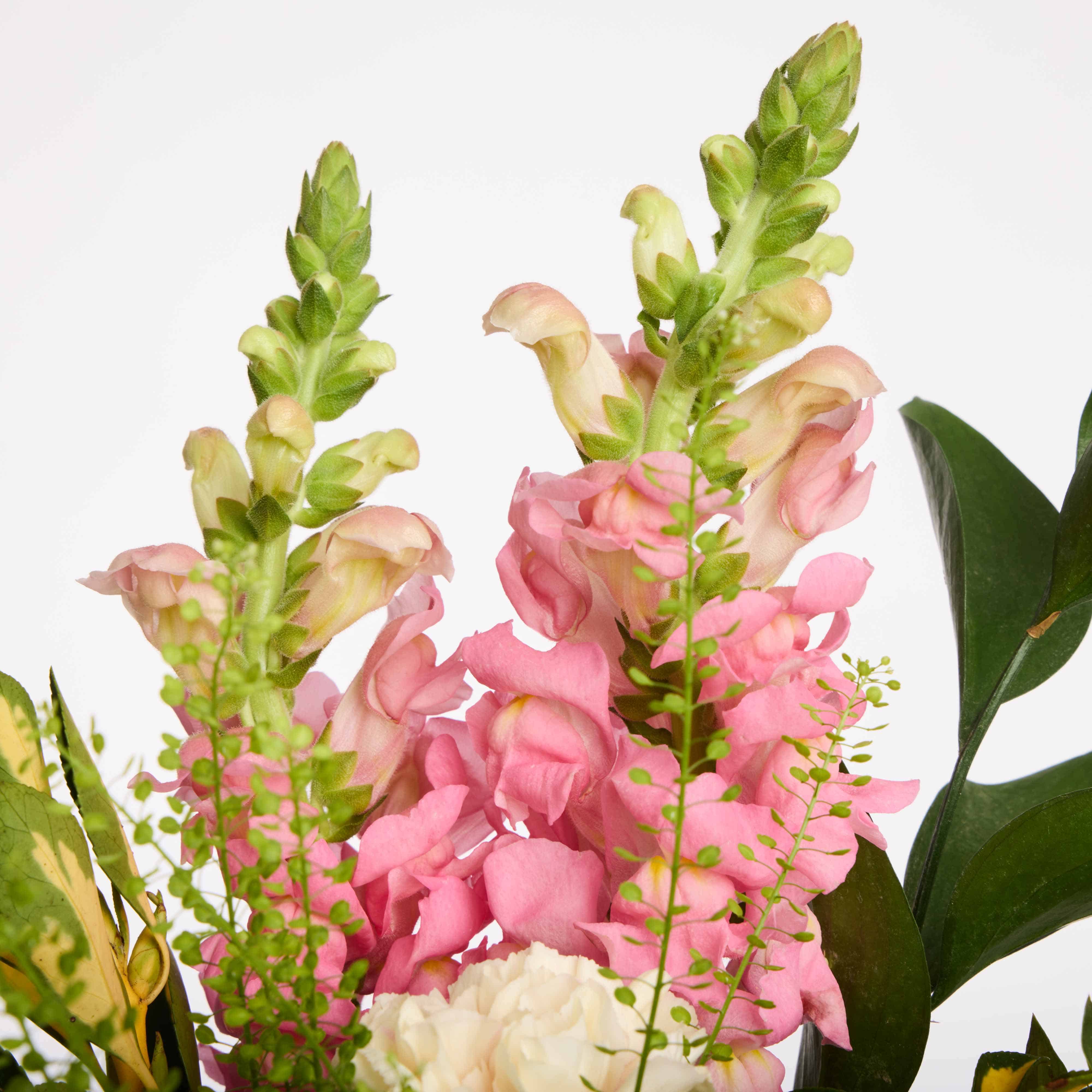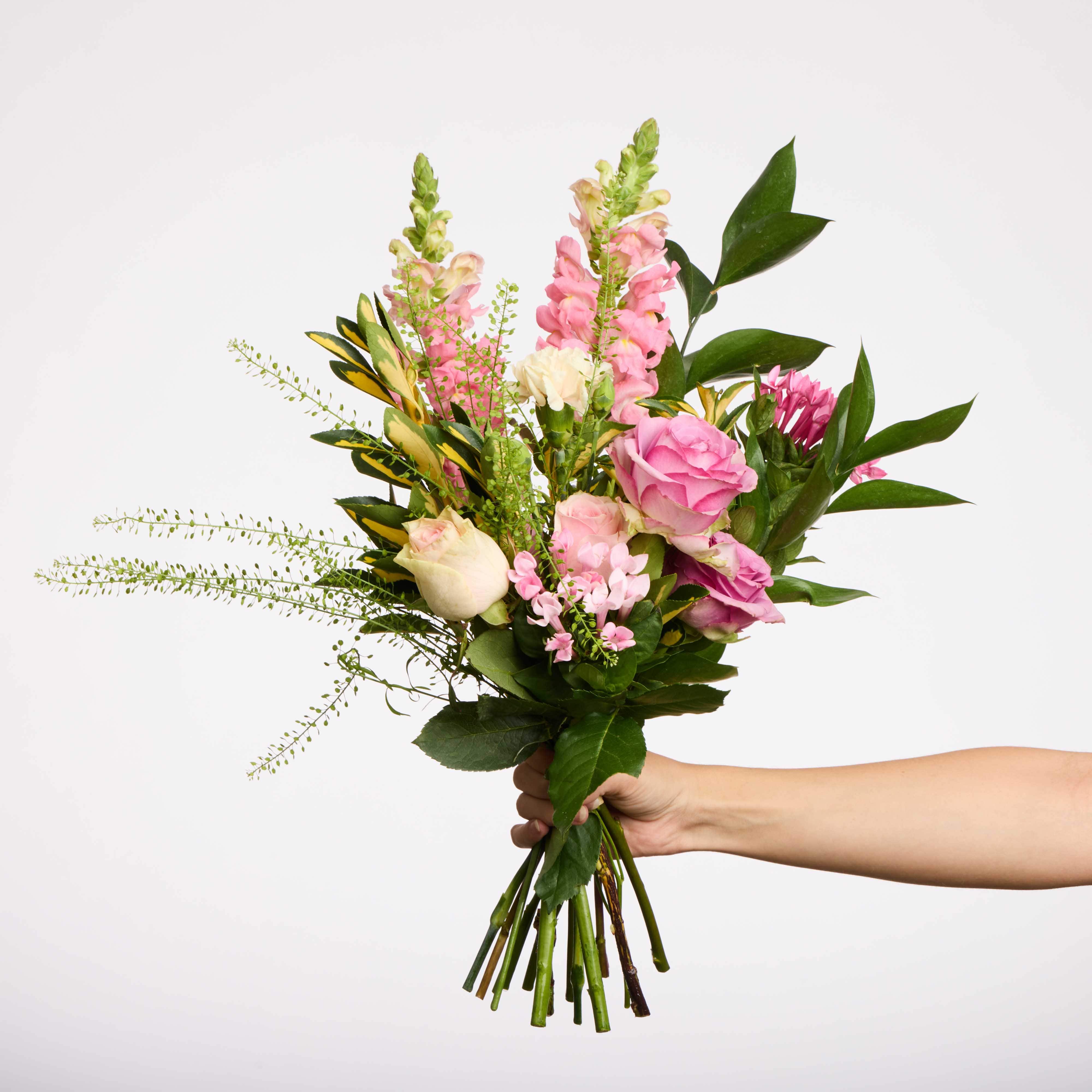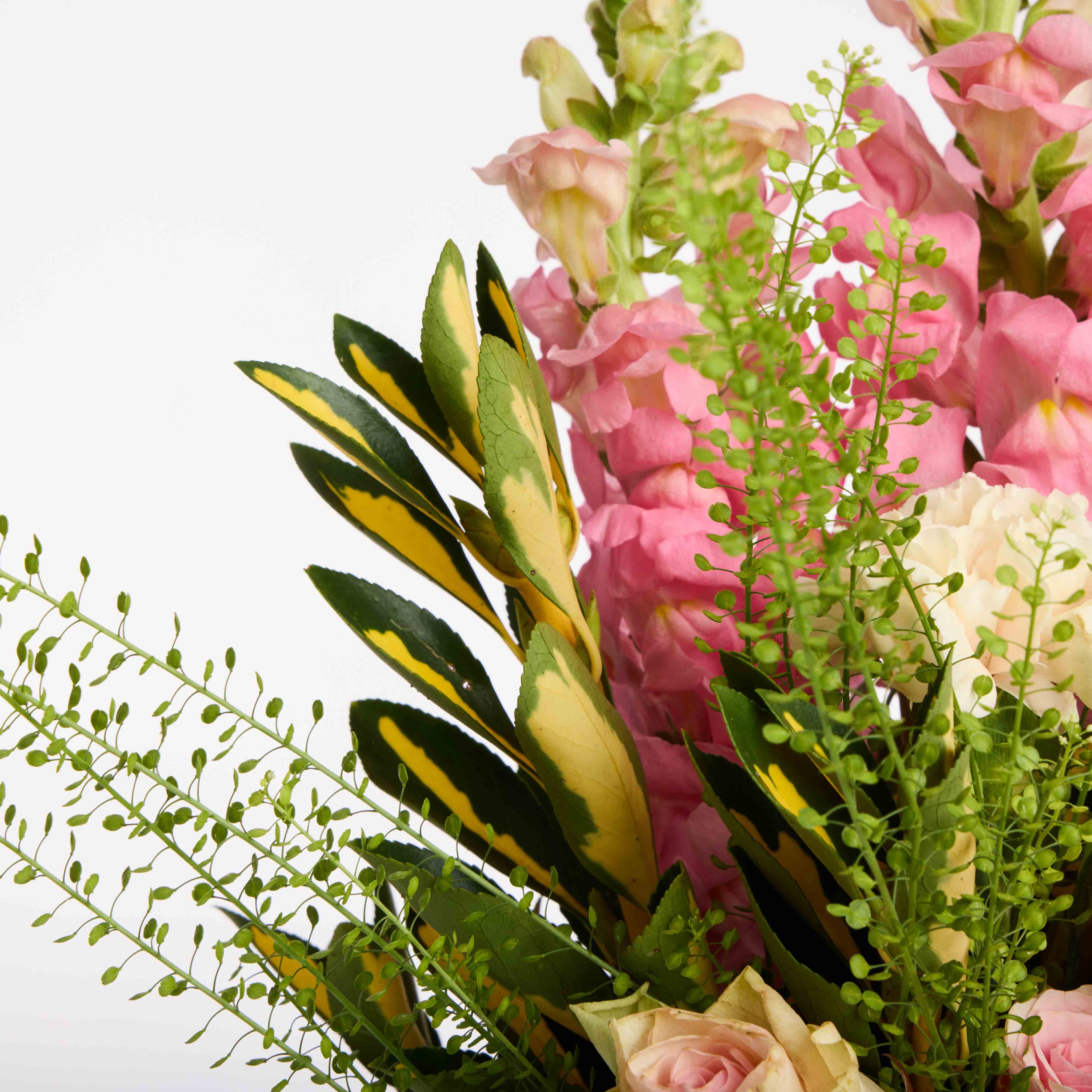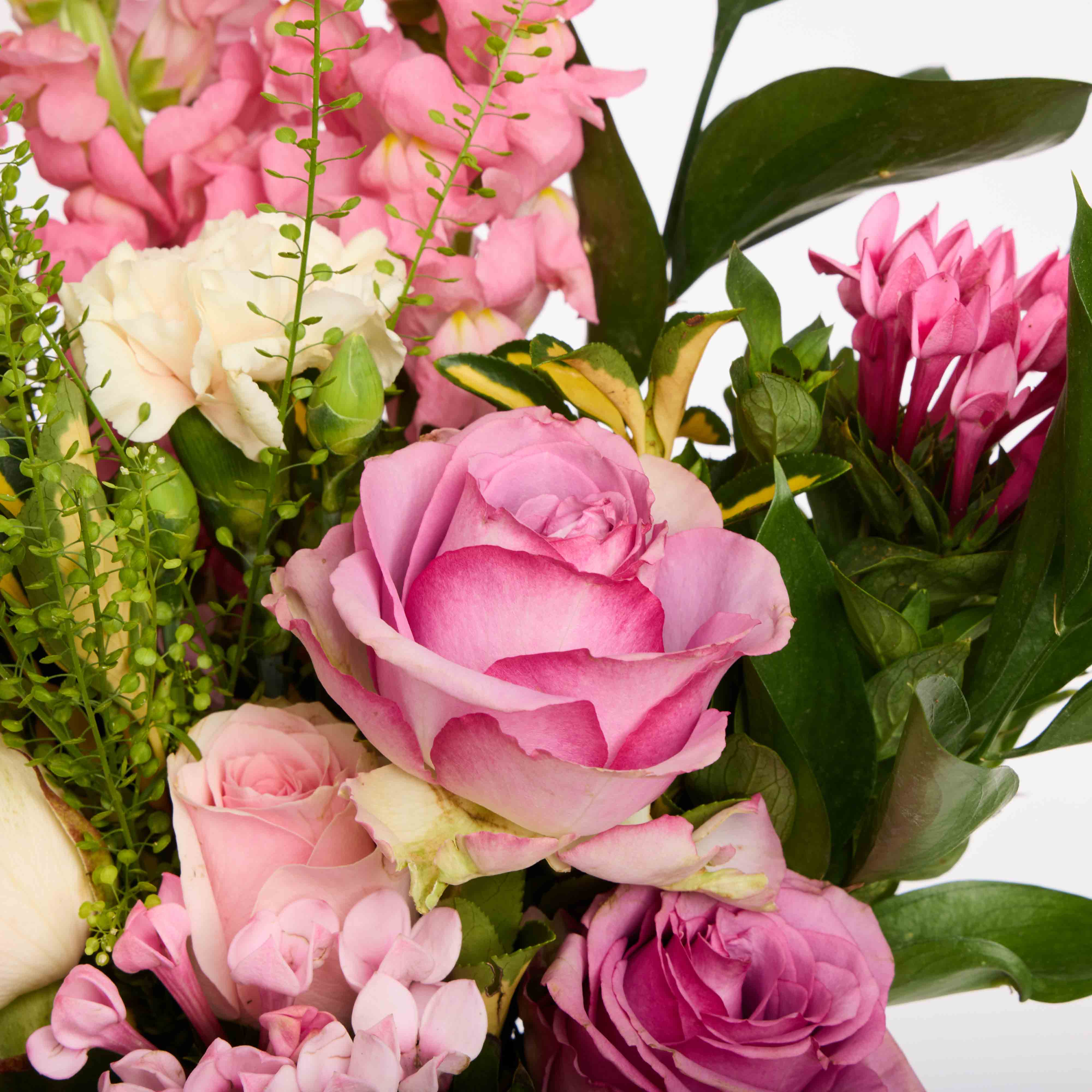 זר קומפקטי בגווני ורוד עם שילוב של ורדים, לוע ארי ופרחים עונתיים שמוסיפים לו קלילות ונוכחות עדינה.